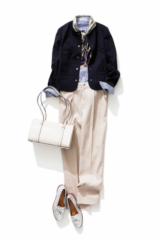 ノーカラージャケットをオフィスカジュアルにアレンジ。春のワードローブの定番、ロンストシャツで品よくハンサムに。首元にスカーフをプラスしてあげると、一気に垢抜けます。