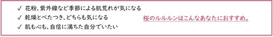 ルルルンからの季節のおくりもの「プレミアムルルルン桜(さくらの香り)」が今年はリニューアルして新登場。春は紫外線、花粉や湿気などでお肌がゆらぎがちな季節。そんなお肌を考えて、ふたつの「桜エキス*1」や「よもぎエキス*2」を配合し、成分がパワーアップ。春の恵みをぎゅぎゅっと凝縮し、ツヤめくうるおい美肌へと導きます。あなたらしさが満開の春になりますように。