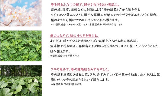 *1 整肌成分 ソメイヨシノ葉エキス、保湿成分 サトザクラ花エキス *2 整肌成分 ヨモギ葉エキス ]