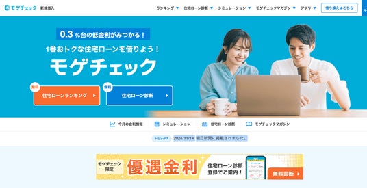 「モゲチェック」は、オンラインで最適な住宅ローンを提案する無料の住宅ローン比較診断サービスです。情報を入力すると、「金利順」「保険充実順」など自分が重視するポイントごとに整理された住宅ローンランキングや、お客様の属性や希望条件から最適な住宅ローンをモゲチェックが提案する「住宅ローン診断(旧モゲレコ)」も提供しています。
