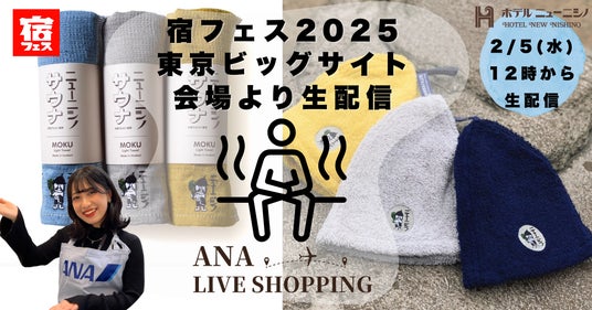 ・通常はホテルでしか手に入らない鹿児島のサウナの聖地「ホテルニューニシノ」のサウナグッズを、ライブコマース「ANA LIVE SHOPPING」と宿フェスの会場のクロスチャンネルにて販売します。