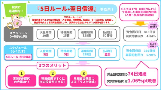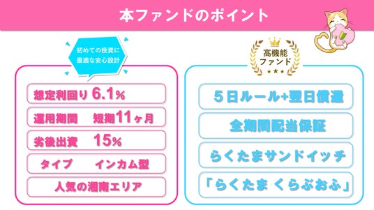 『らくに、たまる』をコンセプトに、不動産知識や投資経験が少ない方でも、1万円から楽しく安心して参加できるファンドをつくります。『らくたま』は投資家ファーストでいつも考えます。