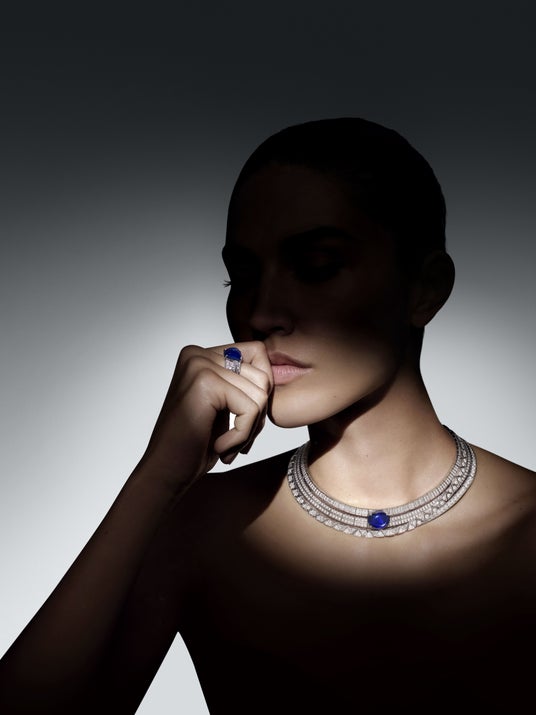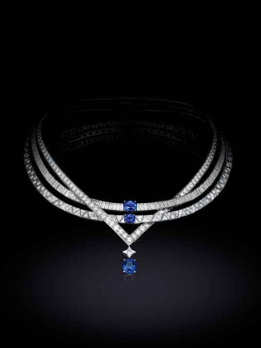 時代の進歩と移動手段の発展の到来に後押しされた「Gravite」は、当時のフランスの物理学者フーコーが示した、科学的な精密性と目に見えないものへの視点を踏襲したもの。砂の上に360度の花びら形の重力を刻んだ「振り子」のように、ルイ・ヴィトンのデザインは、貴金属を導管のように見立て、並列と速度の相互作用における調和を実現します。完璧にバランスの取れた「Gravite」は、さまざまなセッティングやダイヤモンドのカットで遊び心を効かせ、視線を導きながらデザイナーの意図を強調。長方形、三角形、円形のダイヤモンドパヴェをセットした列が連なり、グラフィックの正確さを表現。列を連ねたり重ねたりしながらV字型のペンダントが形作られ、息を呑むほどに美しい6.48カラットの取外し可能なカシミール産サファイアがあしらわれています。さらに、完璧なシンメトリーでセットされた2つの4.38カラットと2.13カラットのカシミール産サファイアがペンダントの上部に施され、動力を働かせるように、連結の要となりながら複雑に重なり合います。このホワイトゴールドのダイヤモンドとサファイアをあしらったネックレスには、2,058時間の作業を必要としました。同様のインスピレーションから生まれた3連のチョーカーにも、幾何学的なパターンと重ね合わせる相互作用が生かされ、中心となる27.20カラットのサファイアのクオリティに魅了されます。さらに、リングとブレスレットもデザインのグラフィックな正確さを追従しながら輝きと動きでエネルギーを放ちます。「Gravite」の中心に宿るパワーは、2種類のネックレスと同様に、目を奪われるサファイアで各デザインを引き立て、揃いのブレスレットとリングのセッティングや動きによって際立ちます。