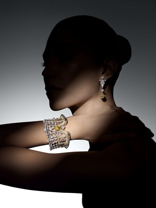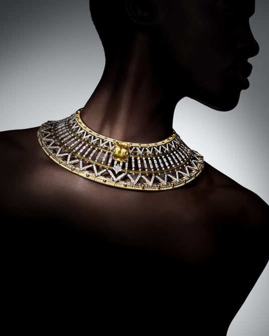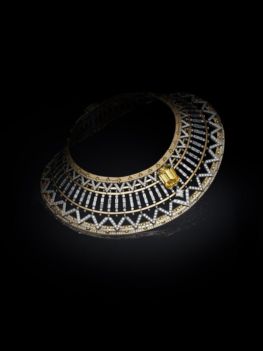 本コレクションの傑作の中には、エッフェル塔に捧げるルイ・ヴィトンの讃歌を表現したクリエーションも。「Victoire」は製作に3,923時間を超える作業を要し、比類なきサヴォアフェール(匠の技)と技術的な野心を独創的に解釈し、このパリのランドマークの技術的な偉業を讃えます。ラインナップの主役は、建築性と芸術性を込めながら精緻に創り上げた魅力的なハイカラーネックレス。「Awakened Hands」から「Awakened Minds」への相互関係を表現する、先見の明に満ちたテーマを示す代表例です。エッフェル塔を彷彿させる印象的な幾何学模様の細工は視線を下へと誘い、メゾンを象徴する「V」に向けさせます。これまでにない技術的な卓越性を誇る驚異的な10.04カラット 、D IF グレードと3.19カラット、 D IF グレードのLV モノグラムスターカットダイヤモンドは、デザインの内から溢れる情熱を伝えます。何層ものネックレスに散りばめられた33個のイエローダイヤモンドを戦略的にセッティングし、光り輝くコーラスラインを形成しながら、「Victoire」のモダニティへの讃歌を高らかに響かせます。同様に、2つの印象的な5.05カラットと5.07カラットのイエローダイヤモンドがあしらわれたペンダントイヤリングは、これまでのルイ・ヴィトンのハイジュエリー コレクションの中で最もプレシャスなものに。「Victoire」の独創性が表現された3.98カラットのイエローダイヤモンドのブレスレットと2.56カラットのリングは、グラフィックの世界とその可動性を追求し、エッフェル塔の解釈を動きの中の建築的驚異に例えます。大胆な緻密さと構築的な機敏性を誇り、その後のシュールレアリスムの到来をも示唆する「Victoire」は、ルイ・ヴィトンが送る19世紀へのビジョナリーな賛辞として本コレクションを締めくくります。