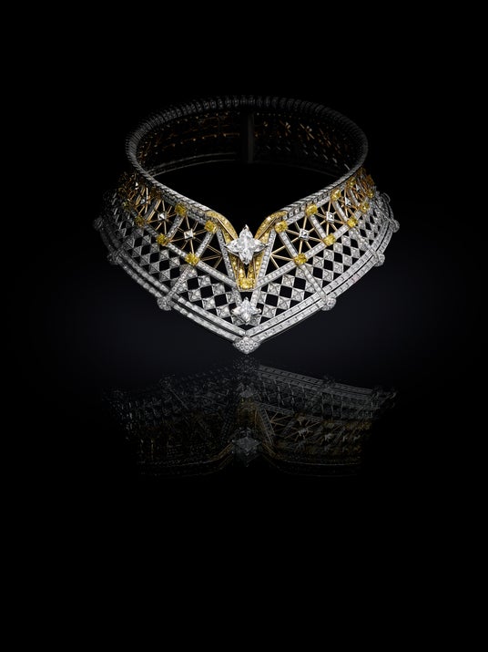 この新たなデザイン言語のダイナミックなクオリティが光を当てるのは、19世紀のモダンな集産主義への道。非常に構築的なネックレスは、リンクを美しく配列した細工により、一連の力強いグラフィックコードの中で動きをもたらします。旅という現象がルイ・ヴィトンを革新性の最前線に立たせたように、動きの相関性をグラフィカルに表現しながら、メゾンのハイジュエリー コレクションが掲げるビジョンと大志を前に推し進める「Dynamisme」。立体的な2連のオープンシェブロン・モチーフは、卓越した技術を際立たせます。自転車やエンジンと同様に、リンクは連携して作用し、視覚効果を発揮。プラチナとイエローゴールドを使用することで、三角形のコントラストがプレイフルに強調され、デザインの方向性を高めます。イエローゴールドに角度を付けてセットされたラウンドダイヤモンドがルイ・ヴィトンの「V」を連想させ、戦略的に配した2つの1.59カラットのLV モノグラムスターカットダイヤモンドへと視線を導くドミノ効果を生み出します。バゲット型のフレームにセットされた連動するスクエアシェイプダイヤモンドが、しなやかで幾何学的なデザインの中を縫うようにあしらわれ、「Dynamisme」のパワーの中心へと行き着きます。この時代への賛辞とルイ・ヴィトンの専門的な表現として、LV モノグラムスターカットダイヤモンドは、オープンシェブロン・モチーフのネックレス、ブレスレット、イヤリング、リングの中心で輝き、その美しさとパワーを示すと共に、ラグジュアリーを革新性の頂点に据える類い稀なサヴォアフェール(匠の技)を披露しています。