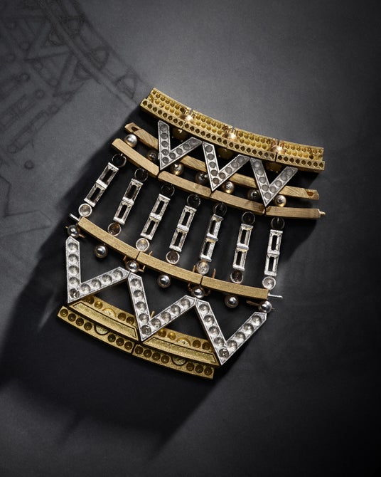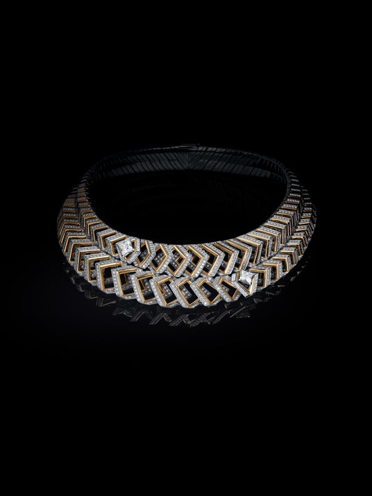 19世紀における産業の成長から着想を得たネックレス「Vision」は、旅の力を生かすことで鉄道の機械化との関係性を探求します。リンクやラグジュアリーに再解釈したビス(鋲)で遊び心を効かせ、各層が連結した多連のネックレスは、プラチナ、イエローゴールド、ダイヤモンドを使用することで産業革命を通して生まれた驚異を反映。ダイヤモンドバゲットとビス(鋲)が交互にセットされたイエローゴールドの三角形モチーフは、その輪が拡大するにつれてデザインの緻密さを増し、メゾンのコードを広大な探求へと駆り立てます。内在する光が脈打つように、矢の形をしたバゲットが、ルイ・ヴィトンのビジョンを集約しながら増大し、エネルギーを放ち続けるコード化されたグリッドを作り上げます。同時に、こうした19世紀の発明により、メゾンを象徴する誠実さも見て取れます。長方形のダイヤモンドバゲットは、ネックレスの下層にプレシャスな輝きで最大限のパワーをもたらし、製作に2,504時間を要したデザインに込められた幾何学的な意味が、その機能を想起。