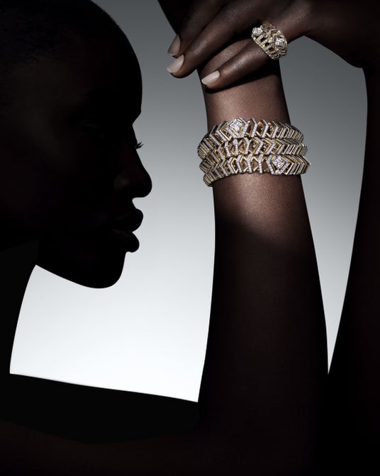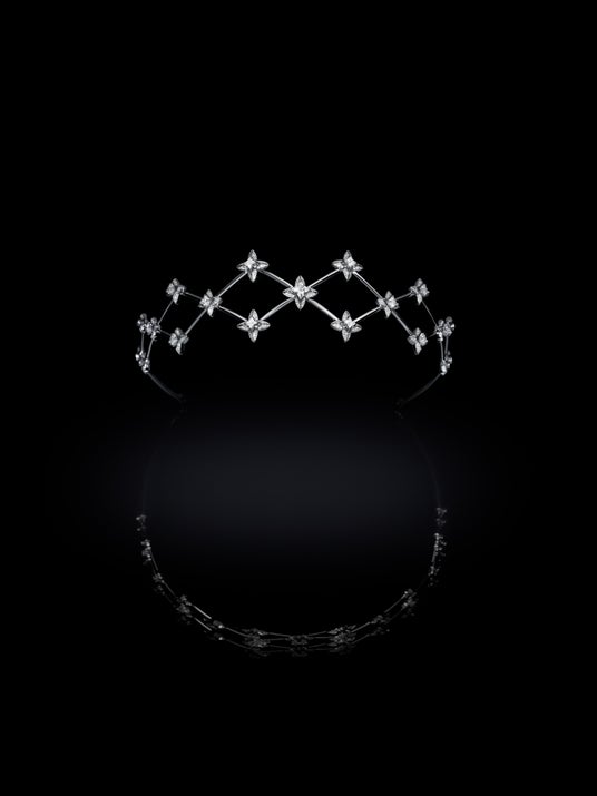 繊細なホワイトゴールドとLV モノグラムスターカットダイヤモンドからなるヘッドバンドは、ルイ・ヴィトンを時代の使者として讃えます。額にまとう幾何学的な格子模様は、「Awakened Hands」の細工と、その後の「Awakened Minds」の熟練の技を想起。伝統と本コレクションならではの発明へのオマージュを融合し遊び心を加えたヘッドバンドは、メゾンのグラフィックコードに精緻でフェミニンな繊細さを添えます。身体の動きに完璧に沿うLV モノグラムスターカットダイヤモンドのモチーフが各デザインに織り込まれ、驚くほど見事な仕上がりに。ダイヤモンドを連ねたチェーンをV字型に配置することで、トランスフォーマブルなブレスレットのグリッド状のオープンウィーブ構造が「Elegance」の象徴となるLV モノグラムスターカットダイヤモンドを集約。同じデザインは、2種のイヤリングにも美しく表現されています。1つは連動させたLV モノグラムスターカットダイヤモンドが滝のように流れるタペストリーを想わせ、もう1つは純粋さをシンプルに際立たせたもの。卓越した繊細な細工により、合計約18カラットのLV モノグラムスターカットダイヤモンドを中心に「Elegance」の遊び心が表現され、トランスフォーマブルなブレスレットやブローチなど、厳選された宝石が本コレクションを比類のない美しさと熟練の技で見事に飾ります。