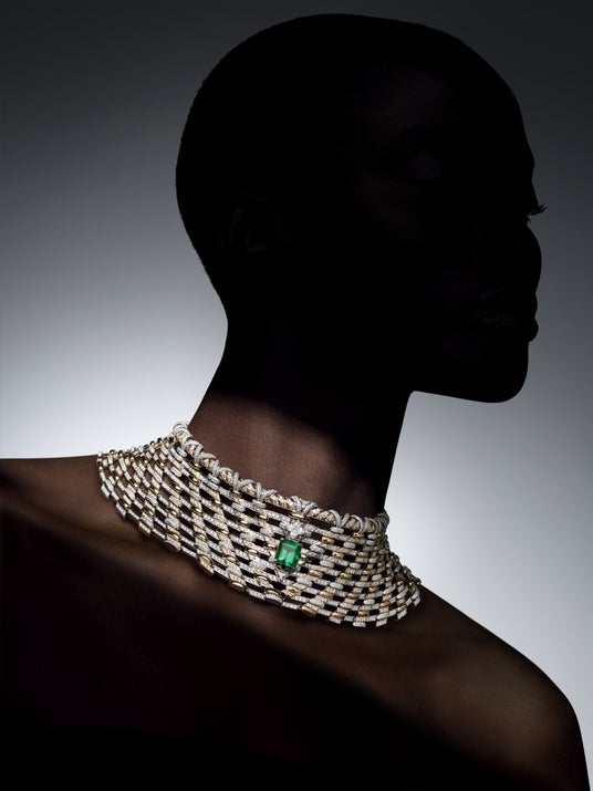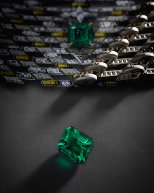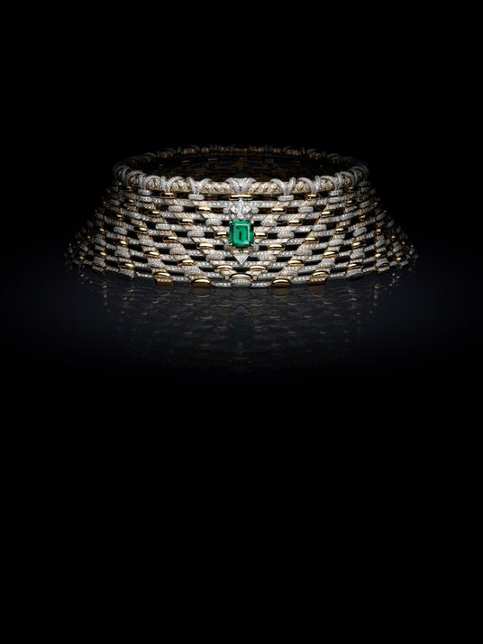 フランスの磁器の技術から着想を得て、名高い格子細工や華麗な装飾、そして色彩豊かなレイヤーを取入れたこのジュエリーには、フランチェスカ・アムフィテアトロフによるディテールや革新性に対するこだわりと、その力強さが調和。技巧に富んだデザインの中でも代表的な「Phenomenal」のロープモチーフは、ルイ・ヴィトンのイコノグラフィーを盛り込んだネックレスにおいて、大胆で幾何学的な表現を用いるアムフィテアトロフの特徴的なスタイルを再提示します。曲線的なパターンは、バゲットダイヤモンドを配したパーツやダイヤモンドをふんだんにあしらったリングに、ゴールドを織物のように組み合わせ、メゾンのシグネチャーである「V」を想わせるデザインに。中心にはLV モノグラムスターカットダイヤモンドの下に優美な7.44カラットのコロンビア産エメラルドが輝きます。これは、メゾンの熟達した宝石鑑定士が調達したもので、「Phenomenal」のオープンウィーブ構造の複雑さを一層引き立てます。