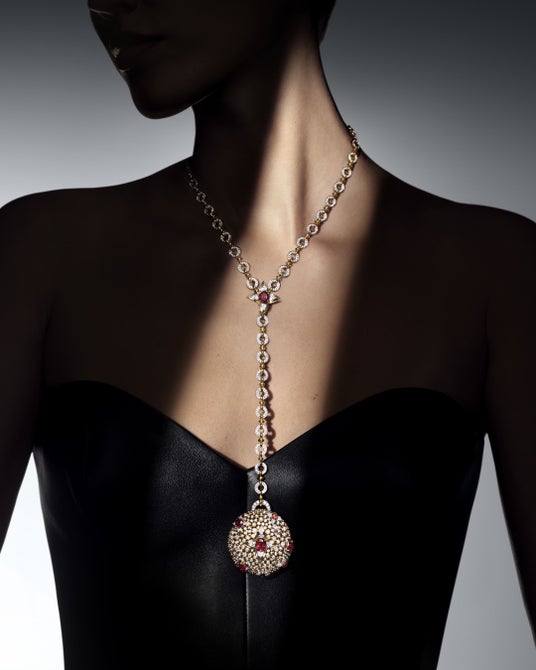 もう1つのルビーによって支えられたダイヤモンドとゴールドのチェーンが、洗練された上品な佇まいでペンダントに調和をもたらします。「Splendeur」の卓越した伝統への並外れた貢献を完結させる揃いのリングとイヤリングは、宝石職人の芸術性を反映すると共に、当時の驚くべき創造性を証明しています。