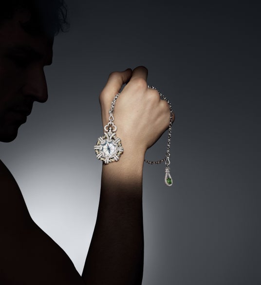 ハイジュエリー コレクションに新たに加わったメンズのカプセル・コレクションは、宝石職人の技術とメゾンの尽きることのないクリエイティビティへのこだわりを際立たせることで歴史的な伝統を一新。本コレクションの普遍的な魅力を引き立てるエレガントなコンパスは、稀少で精緻なオブジェとして、宝石職人の類い稀な手仕事を象徴。ダイヤモンドのかけらがフレームを形作り、チェーンのトップには4.55カラットのツァボライトがあしらわれています。文字盤は曲線を組み合わせてエングレービングを施し、その空間をデザインすることで、手仕事によるメタルワークが動きのある幾何学模様を完璧に表現しています。また、ウォッチのケースは、2.16カラットと2.71カラットのツァボライトを主役とした織物のようなパターンが魅力。 オープンウィーブ構造のネックレス、ブレスレット、リング、イヤリング、そしてコンパスとウォッチの発表を通して、ルイ・ヴィトンはタイムレスなエレガンスと緻密さの継承を表現し、可能性の限界に挑戦し続けています。
