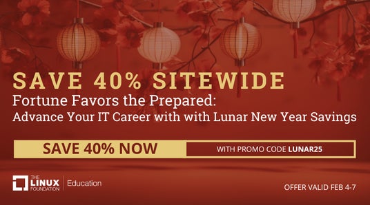 チャンスを活かす準備ができているかどうかは、キャリアに大きな影響を与える可能性があります。2月7日までの旧正月セールを利用して、最新のスキルを身につけて、キャリアアップのチャンスに備えましょう!コード「LUNAR25」で、Linux Foundation Educationトレーニング&認定試験のラインアップを幅広く40%オフで提供します。