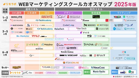 「女性のキャリアをシームレスに」の実現に向けて個人向けリモートワーク実践スクール事業「リモラボ」を運営する株式会社リモラボ(東京都渋谷区、代表取締役 佐伯正邦、以下「当社」)は、、日本国内で展開されている多種多様なWEBマーケティングスクールを“スキル”と“受講期間”の2軸をもとに分類・可視化した「【2025年版】Webマーケティングスクールカオスマップ」を、リモラボ公式ブログ*にて公開いたしました。