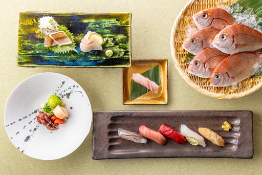 おまかせ鮨コースに、名産地富山県産のホタルイカと、ピンク色の身が桜のように美しい春子鯛を取り入れた春の限定メニュー。雲丹といくらの小丼がセットになり、海の幸をご堪能いただけるメニューです。