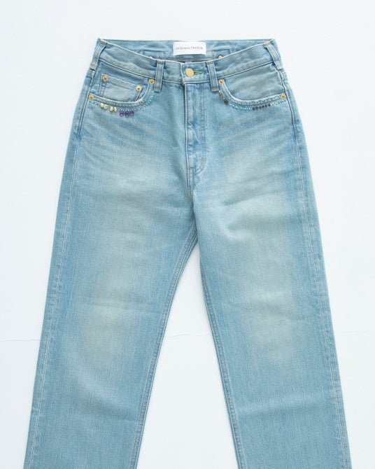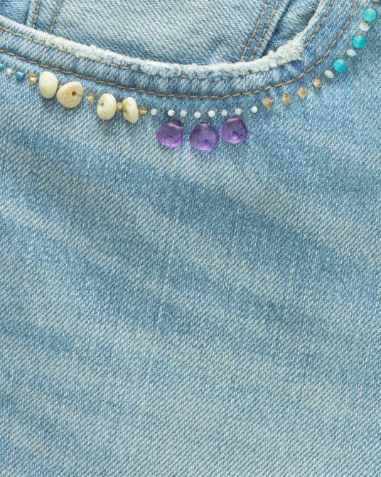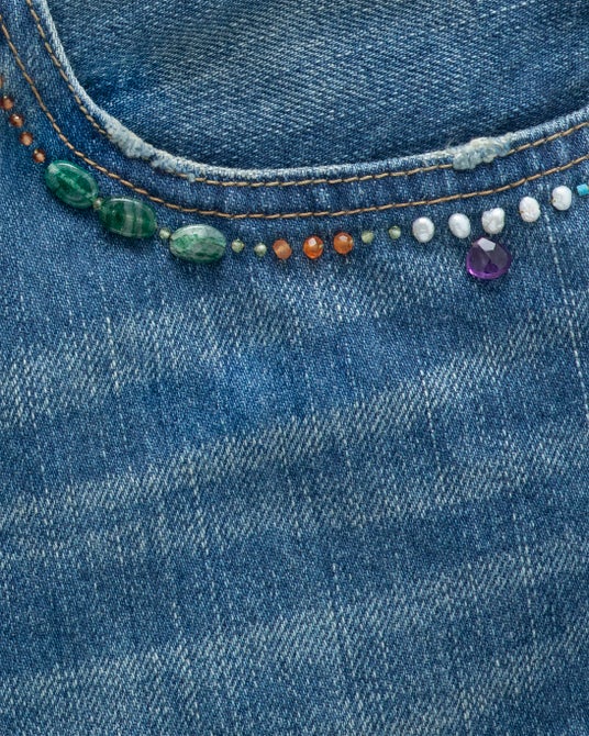 デザイナー佐原氏の、パーソナルな天然石のコレクションを用いた美しいデザインを、豊富なバリエーションからお選びいただき、ジーンズに手刺繍で施します。