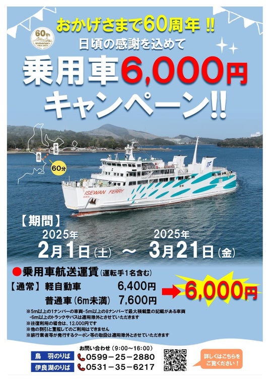 伊勢湾フェリーは60周年キャンペーン開催中で、お得な乗用車運賃でご利用いただけます。