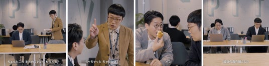 デスクで集中して作業を進めようとしている平井さんの横に現れた上司・浦井さん。ボールペンをこれでもかとカチカチ鳴らしたり、ビニール袋をガサガサ漁り、中からパンを取り出して食べ始めたり、コーヒーを大きな音ですすったり…悪気なく集中を邪魔する行動の数々に、平井さんのストレスは次第に蓄積。その後もダジャレや大きな音でのタイピングなど、空気の読めない行動を繰り返し、やっと真面目に仕事に取り掛かったと思いきや、自席にて大声でリモート会議を開始。極めつけには、真面目に仕事をしている平井さんのタイピング音を注意してくる始末…。ストレスがマックスに達した平井さんは、ガムを噛んで自分の集中を取り戻します。