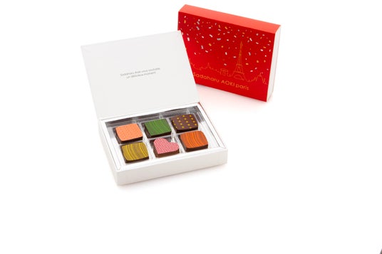 毎年「AOKI」の名を付けて発表している新作ショコラアソート。新作の「ジャンジャンブル」とフランスで最も権威あるショコラ品評会にて最高位の受賞歴を持つ「プラリネ オレ」「パッション」と共に「ピスタッシュ」「オランジュラム」「キャラメルノワ」を加えた計6粒を詰め合わせました。今年は日本上陸20周年の節目。アニバーサリーを祝い乾杯したくなるアペリティフになるようなアソートをテーマにしたスペシャルな一箱です。