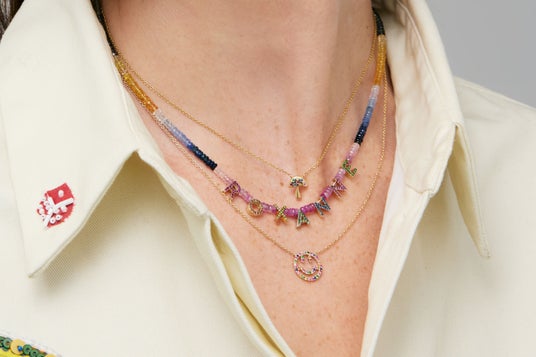 サファイア、ツボライト、ルビーが贅沢にあしらわれたネックレスは、「Have a Nice Day Necklace」と名付けられたブランドオリジナルのデザイン。色彩豊かな天然石と14Kイエローゴールドのコンビネーションは、見る角度によって異なる表情を見せてくれます。
