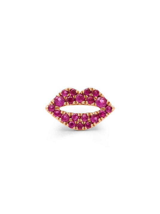 プレイフルなリップモチーフにピンクサファイアの輝きがアクセントを加えた片耳スタッドピアス。14Kピンクゴールドの上質感が、日常にラグジュアリーなムードをもたらします。