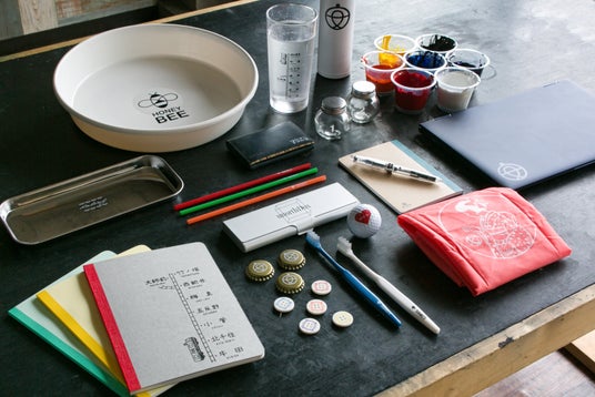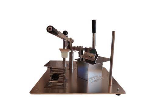 <寛治さん考案の「手動式小型パッド印刷機なんでもくん」。本当になんでも印刷できちゃう!!>
