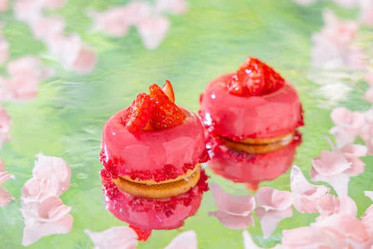 いちごとグリオットのムース:グリオットチェリーにいちごを合わせたムースをサブレにオン