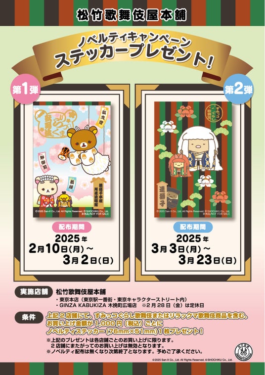 上記2店舗にて、すみっコぐらし歌舞伎またはリラックマ歌舞伎商品を含む、お買い上げ金額が1,000円(税込)ごとにオリジナルステッカー1枚プレゼント!