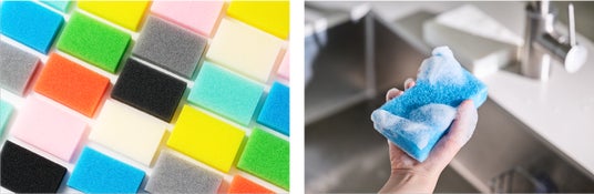 ダイニチ・コーポレーションは創業から、食器洗い用固形洗剤の製造販売を行っています。製造から販売を行う中で、固形洗剤と相性の良いスポンジを研究し、高品質ポリウレタンを使用した、従来のスポンジの概念を覆す「サンサンスポンジ」が生まれました。半年以上使えるほど丈夫で長持ちなので、ごみの削減に。