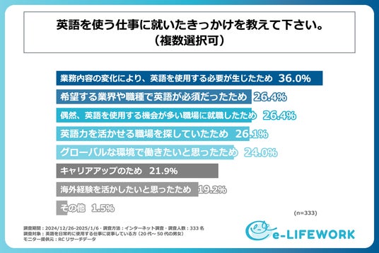 まず、「英語を使う仕事に就いたきっかけ」を尋ねる設問への回答では1位が「業務内容の変化により、英語を使用する必要が生じたため」で36.0%、2位が同率で「希望する業界や職種で英語が必須だったため」と「偶然、英語を使用する機会が多い職場に就職したため」で26.4%という結果になりました。意外にも自分で選んで英語を使う仕事に就いたわけではなく、業務内容の変化により仕事で英語が必要になった人が多い、ということがこの結果からわかりました。