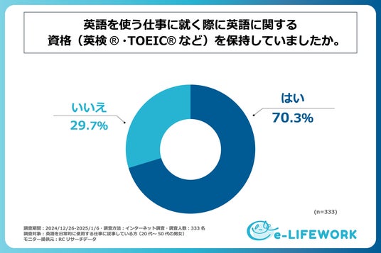次に「英語を使う仕事に就く際に英語に関する資格(英検(R)・TOEIC(R)など)を保持していたか」を尋ねる設問では、「はい」が70.3%、「いいえ」が29.7%という結果となり、大半の人が何らかの英語に関する資格を保持していた、ということが明らかになりました。