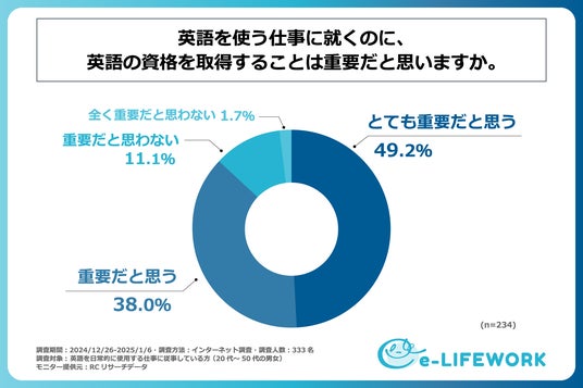 調査の最後、英語を使う仕事に就く際に英語に関する資格を保持していたと回答された方に「英語を使う仕事に就くのに、英語の資格を取得することは重要だと思うか」を尋ねる設問への回答では、1位が「とても重要だと思う」で49.2%、2位が「重要だと思う」で38.0%という結果になりました。1位と2位の回答を合計すると回答率約90%となり、約9割の人が、英語を使う仕事に就くのに、英語の資格を取得することは重要だと考えていることが判明しました。