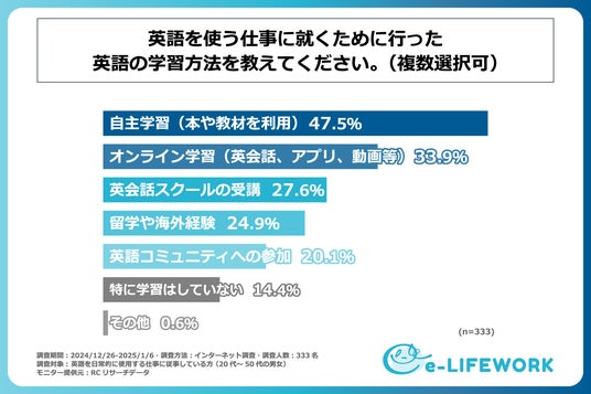 また「英語を使う仕事に就くために行った英語の学習方法」を尋ねる設問の回答では、1位が「自主学習(本や教材を利用)」で47.5%、2位が「オンライン学習(英会話、アプリ、動画等)」で33.9%、3位が「英会話スクールの受講」で27.6%という結果となりました。この結果から、英語を使う仕事に就くために行った英語の学習方法としては、「自主学習(本や教材を利用)」が最も多い、ということがわかりました。