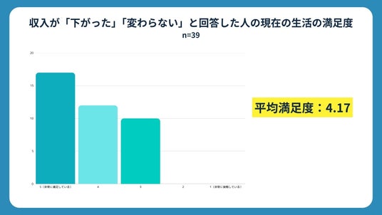 – 「収入が下がった」もしくは「変わらない」と回答した人の生活満足度(n=39)は、「収入が上がった」と回答した人の結果より1.1ポイント少ない、4.17という結果に。