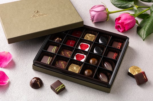 金箔や開業20周年ロゴをあしらったオリジナルボンボンショコラの詰め合わせ。