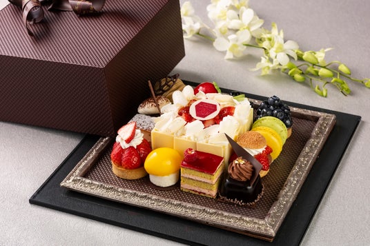 ロビーラウンジのオリジナルケーキやモンブラン、マカロンなどをチョコレート細工のプレゼントボックスでラッピング。お土産やサプライズプレゼントにもおすすめです。