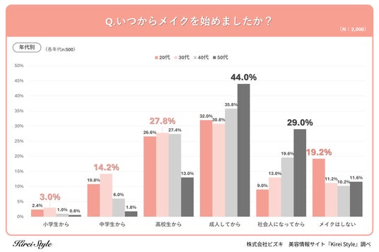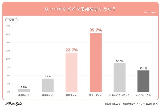 全国の20代~50代の女性2,000人を対象に、「いつからメイクを始めましたか?」というアンケートを実施したところ、最も多い回答は「成人してから」で35.7%となりました。次いで、「高校生から」が23.7%、「社会人になってから」が17.7%と続く結果になりました。一方、「メイクはしない」という方は13.1%となっています。