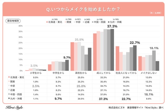 居住地域別で見ると、どの地域でも「成人してから」が最も多くなりましたが、成人する以前からメイクデビューした方が東日本のほうがやや多い傾向があるようです。