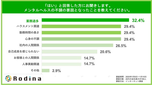 そのほか、「ハラスメント関連(29.4%)」「勤務時間の長さ(29.4%)」「心身の不調(29.4%)」などの回答も上位となりました。