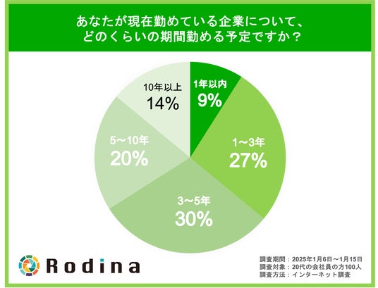 企業に所属する全国の20代の方を対象に、現在勤めている企業にどのくらいの期間所属するかを聞いたところ、もっとも多い回答が「3~5年(30%)」となり、「1~3年(27%)」「5~10年(20%)」と続きました。この結果から、5年以内での退職を考えている方が過半数を超えることがわかりました。