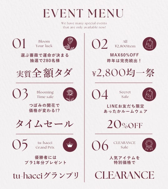 昨年完売続出の¥2,800均一SALEや、つぼみの開花に合わせてOFF率が変わる…!Blooming Time SALEなど特別企画を多数ご用意しております。
