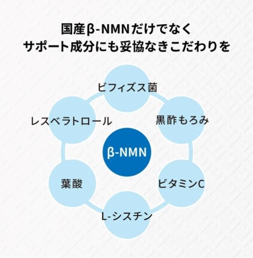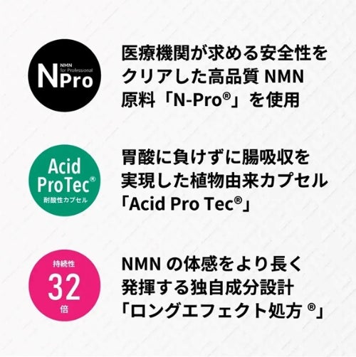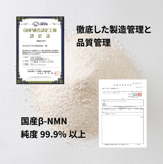 ・国産NMN:国内自社製造した最高純度99.9%以上のβ-NMN「N-Pro(R)」を使用。