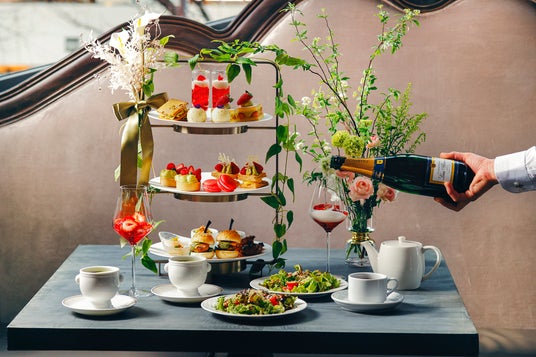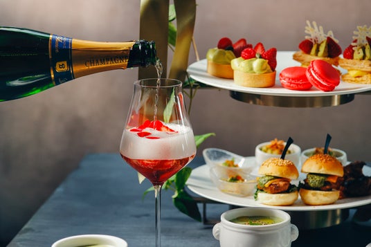 お飲み物はシンガポール創業のラグジュアリーティーブランド TWG Teaの紅茶など全16種類を好きなだけお召し上がりいただけます。また、お酒とともにお楽しみいただけるよう、フレッシュのいちごにローズシロップと花びらを入れ、シャンパンを注いだエレガントなカクテルもオプションで登場します。