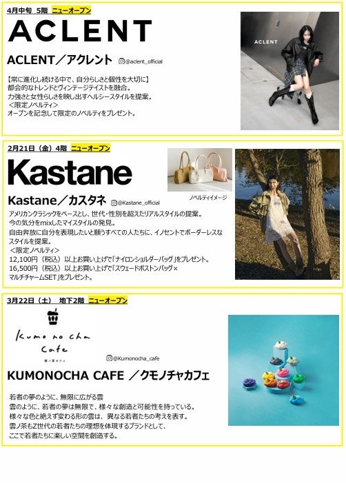 新規出店では、ユニセックスサイズでの商品展開で幅広く着用できるアイテムが支持されているブランド「HTH」、イギリス発の大人気シューズブランド「Dr. Martens」、遊び心溢れるキッチュなガーリースタイルが好評のレディスブランド「merry jenny」、力強さと女性らしさを映し出すヘルシースタイルを提案するレディスブランド「ACLENT」、アメリカンクラシックをベースとし、世代・性別を超えたリアルスタイルブランド「Kastane」が、オープンいたします。
