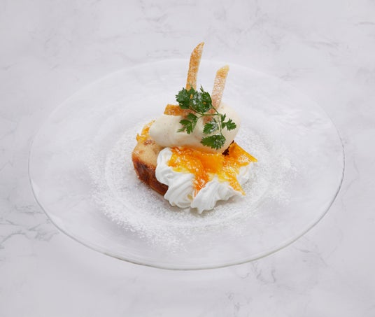 ミゲルフアニ <スペイン料理&ワイン・パエリア専門店>新館7Fスペインの伝統的なアーモンドケーキ「タルタ・デ・サンティアゴ」にシェフの特性の「はっさくマーマレード」を加えた店舗自慢のオリジナルデザートです。