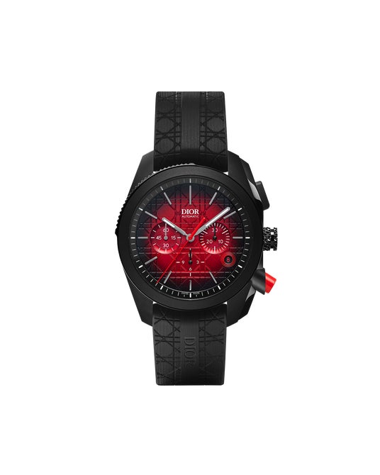モダンに再解釈されたダイアルを際立たせるのは、漆黒の輪郭の中に配した魅惑的なレッドのグラデーション、波状の光沢が煌めくサンバースト仕上げとグラフィックな印象をもたらすカナージュ モチーフ デザインです。メゾンの永遠のシンボルはローターとインターチェンジャブル仕様のラバーストラップにもあしらわれ、ディオールのトータルルックを演出し、あらゆるコントラストを生み出すウルトラマット仕上げと光沢のあるディテールの組み合わせが、圧倒的な存在感で見る者を魅了する大胆な表情を付加します。