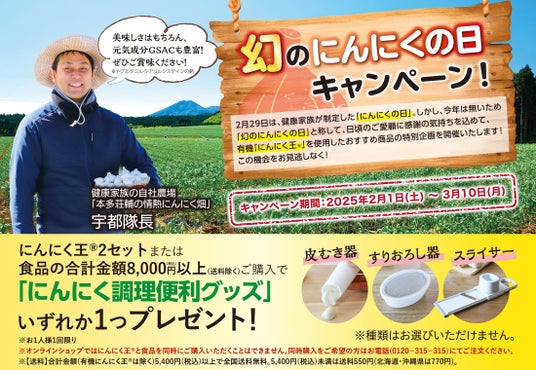 詳細は、特設キャンペーンページ(https://www.kenkoukazoku.co.jp/ninniku_cp/)をご確認ください。