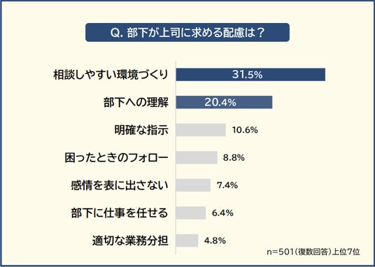 「部下が上司に求める配慮は何か?」という問いには、「相談しやすい環境づくり(31.5%)」と回答した人がもっとも多くなりました。2位は「部下への理解(20.4%)」となっています。