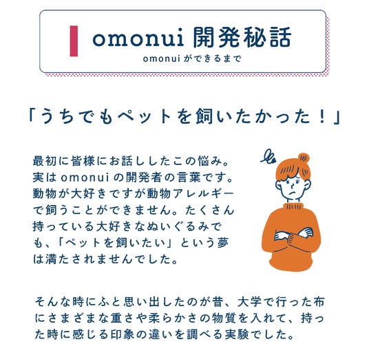 満足できないポイントがコミュニケーション。omonuiは、電力で動くのではなく、中に入れる綿と重りの量をグラム単位で調整することで、まるでomonuiが甘えて体をあずけてくれているような、絶妙な脱力感が生まれています。ヒトが一方的に抱き着く一般的なぬいぐるみにたいして、omonuiは重さがあることで、自然とomonui側からも抱きつかれているようなコミュニケーションが生まれます。
