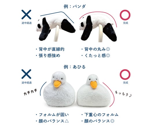 動物だけでなく、ぬいぐるみも大好きなので、顔のバランスや綿の量、柔らかさ、ポーズなど、かなり細かい部分までこだわり、工場の方には何度も何度も修正をしていただきました。