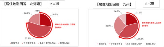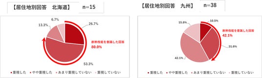 また、回答者の居住地別の回答を見てみると、気温の低い北海道では断熱性能を「重視した」「やや重視した」と回答した人が合計80%と高い数値を示しましたが、比較的温暖な気候と言われる九州では42.1%に留まり、居住地の気候による意識の違いが見える結果となりました。