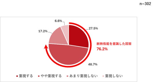 「今後の住まいを決める際に猫のために断熱性能の高さを重視するか」の問いには合計76.2%の飼い主が「重視する」「やや重視する」と回答し、現在に比べて断熱性能を意識する回答が15%以上多くなりました。